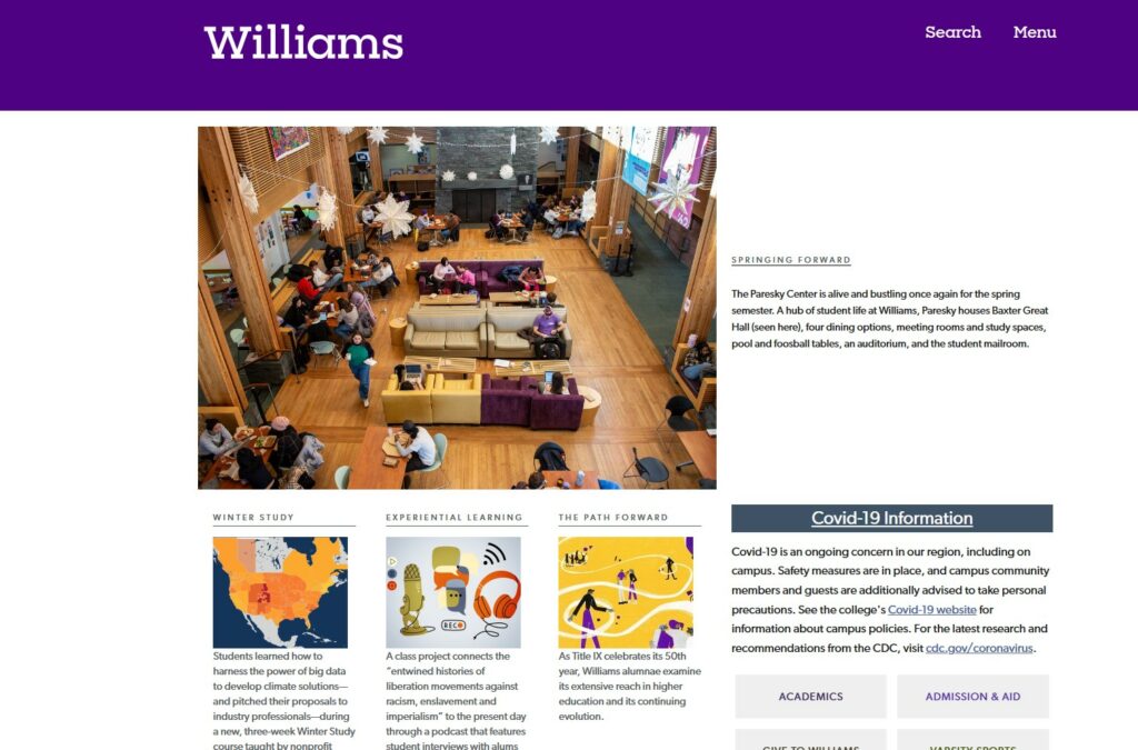 The Paresky Center is alive and bustling once again for the spring semester. A hub of student life at Williams, Paresky houses Baxter Great Hall (seen here), four dining options, meeting rooms, and study spaces, pool and foosball tables, an auditorium, and the student mailroom.